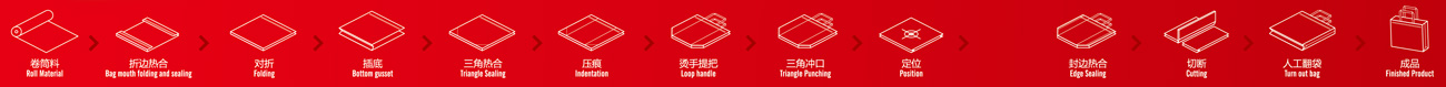 2、工序流程:卷筒料折邊一穿繩一熱合對折插邊定位---打孔 -一熱合切斷收集成品。